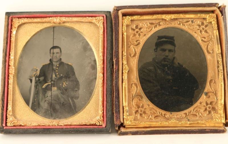 Black embossed leather with engraved metal inside with photos of Civil War soldiers. Show age.