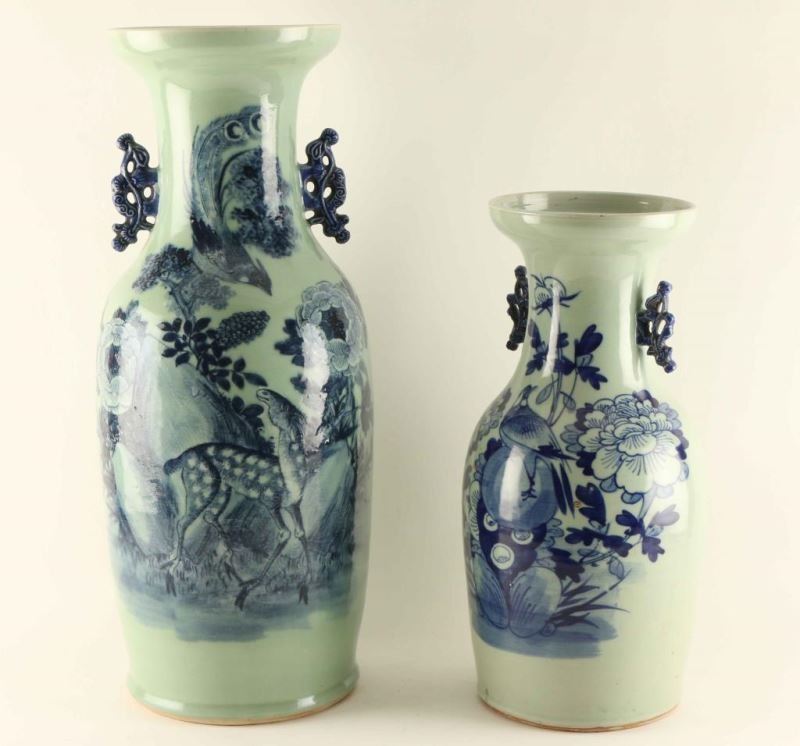 Painted dark blue floral, bird and animal motifs on light blue vases with ornate handles. Measure 17"x8 1/2" and 23"x10". Very nice accent pieces.