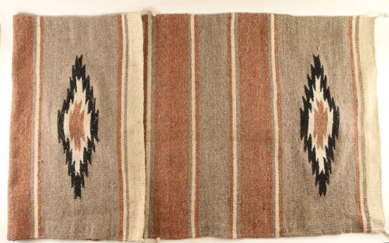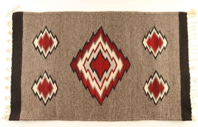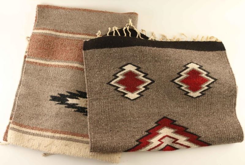 One with eye dazzler pattern in gray, black, white and red. Measures 39"x29 3/4" tightly woven-good condition. The other rug has eye dazzler with stripes in brown, gray, black and white. Shows some wear and weave is coming apart on one side.