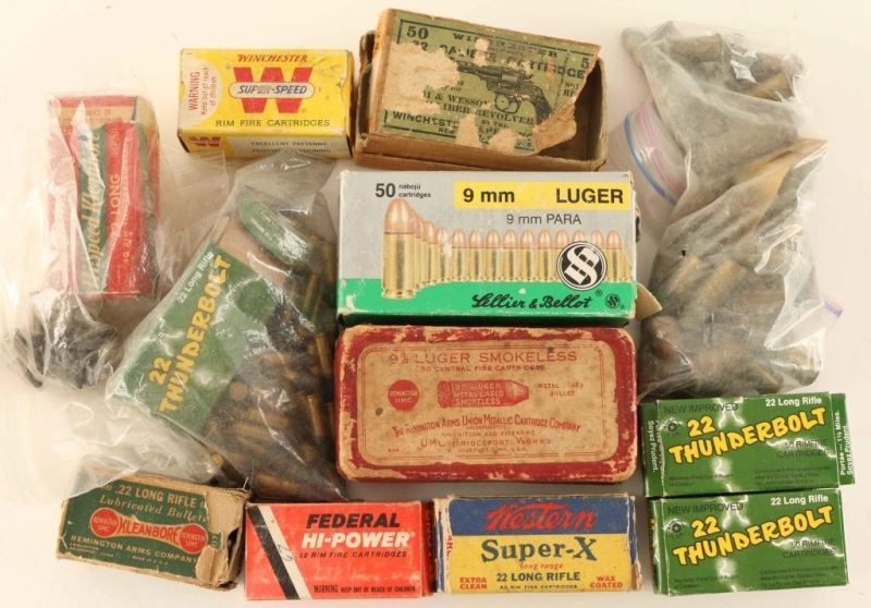 Including; Lillier & Bellot 9mm Luger-19 Rds, Remington 22L-12 Rds, assorted bag o bullets approx. 30 Rds, 9mm Luger Smokeless-13 Rds, .22LR Thunderbolt approx 110 Rds, Federal Hi-Power 22LR-20 Rds, Remington Kleanbore 22LR 20 Rds, Western Super X 22LR-22 Rds, Winchester 22LR/S-50Rds.