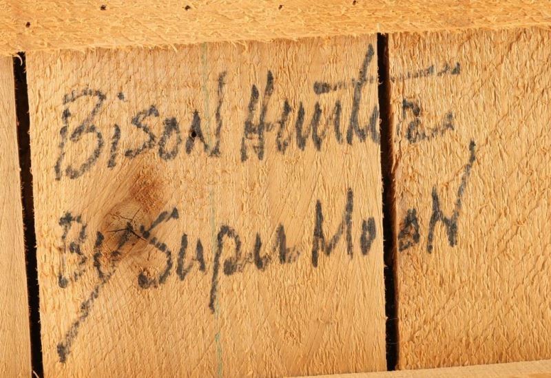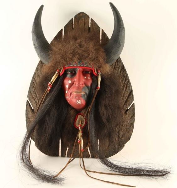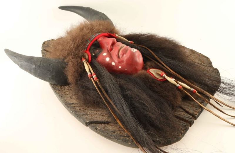 "Bison Hunter" by Super Moon 165/500. Lifelike mask with glass eyes and painted face with leather, hair, bead and antler accents. Measures 20 3/4" x 15 1/2".