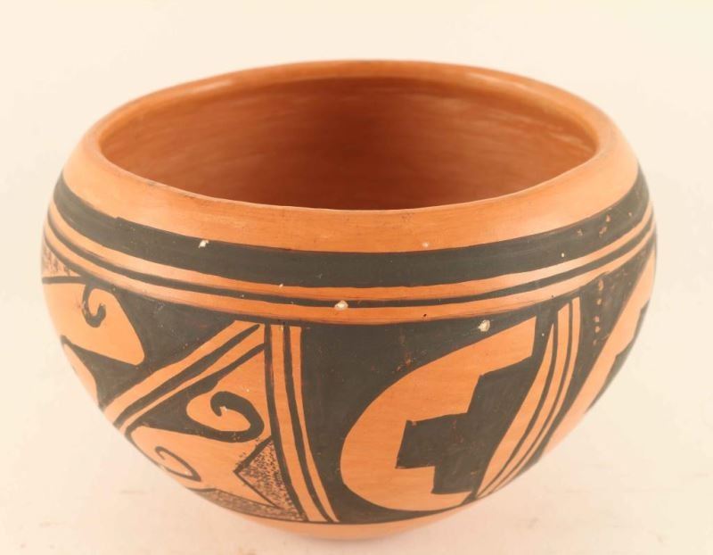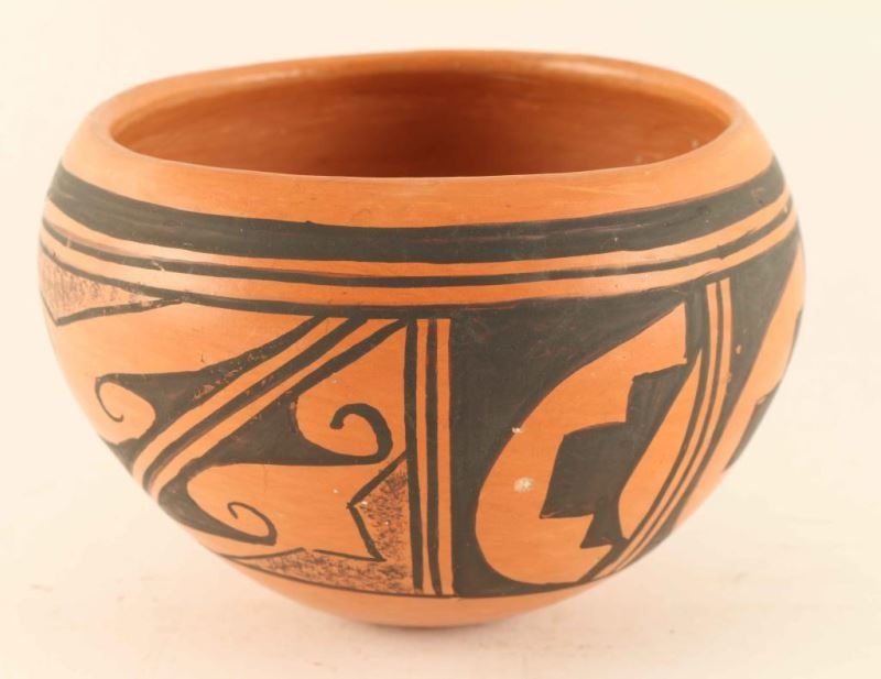 Circa 1950s with black geometric design on red clay. Measures 4 3/4"x 3 1/2". Some small chips otherwise good.