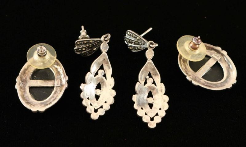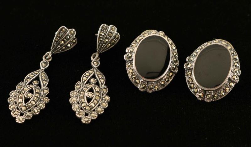 One pair of marcasite on scalloped silver with a black oval stone inlay, and one pair of post silver dangles set with marcasite in an Art Deco design.