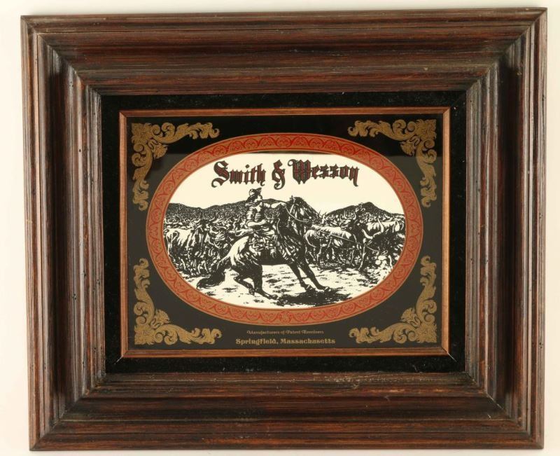 Black, gold and red paint in fancy scroll design with a cowboy in the middle of a herd of cattle in the center. Reads "Smith & Wesson, Manufacturers of Patent Revolvers, Springfield, Massachusetts" in wood frame with black velvet inset. Mirror measures 11 1/2"w x 8 1/2"h.