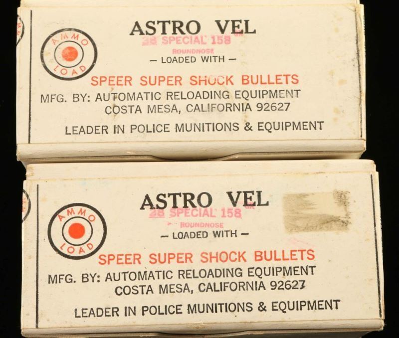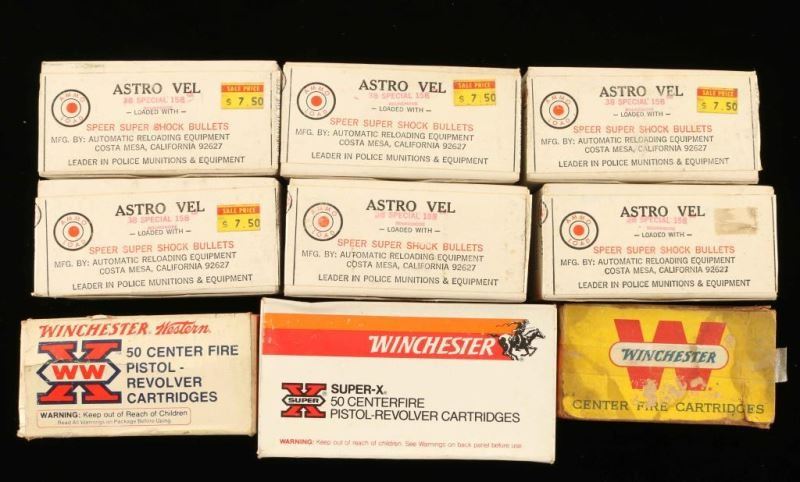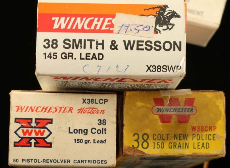 Including; 6 boxes Astro Vel Speer Super Shock 38 Spl-300 Rds, Winchester Super X 38 S&W-35 Rds, Winchester 38LC-50 Rds, and Winchester 38 Colt New Police Lead-30 Rds.