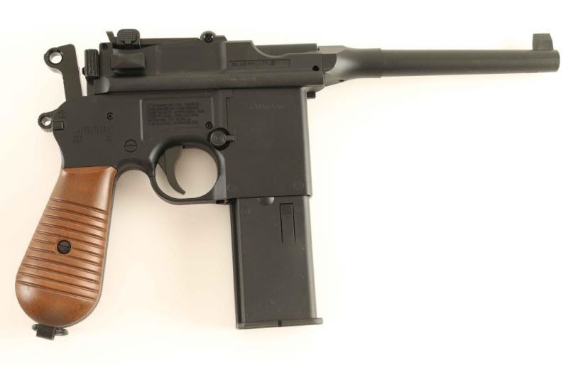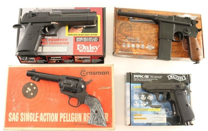 Including' Umarex Walther PPK/S SA in box with manual, Umarex Selbstladepistole C96 in box with manual, Daisy Power Line 400 SA with clips and manual in box, and a Crosman SA6 .22Ca shows use and wear in box with manual.