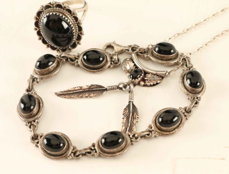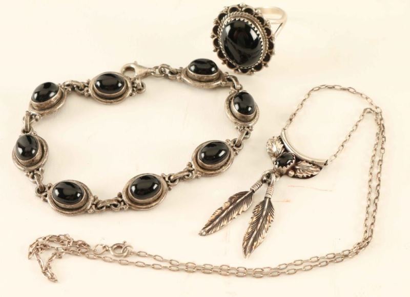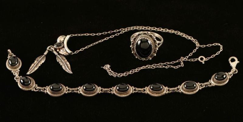 Including; oval stone ring inset in silver rope and scallop design marked 'PY' and 'Sterling' size 11 1/4, pendant with small oval stone with leaf motif and feather dangles marked ''BJ' and '.925' on silver chain, and a link bracelet with eight oval black stones marked '925'.