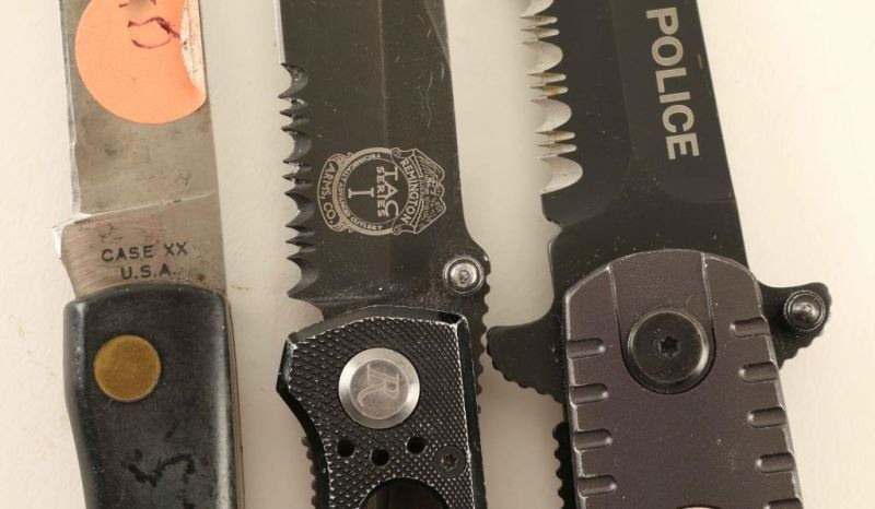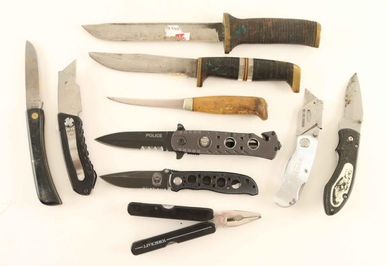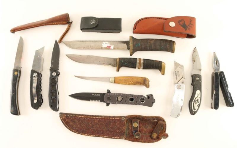Including: Small fillet knife with wood handle in leather sheath, metal folding knife with Police shield, stacked leather handle knife with brass bolster and heel, leather stacked handle knife with brass bolster and heel in leather sheath, Remington Arms Tac I Series folding knife, Yorkcraft folding pliers and tools in case, Case XX 2138 folding knife, steel folding knife with eagle motif rubber handle, 2 Husky folding utility blades, and a leather sheath with elk design. All knives show use and wear.