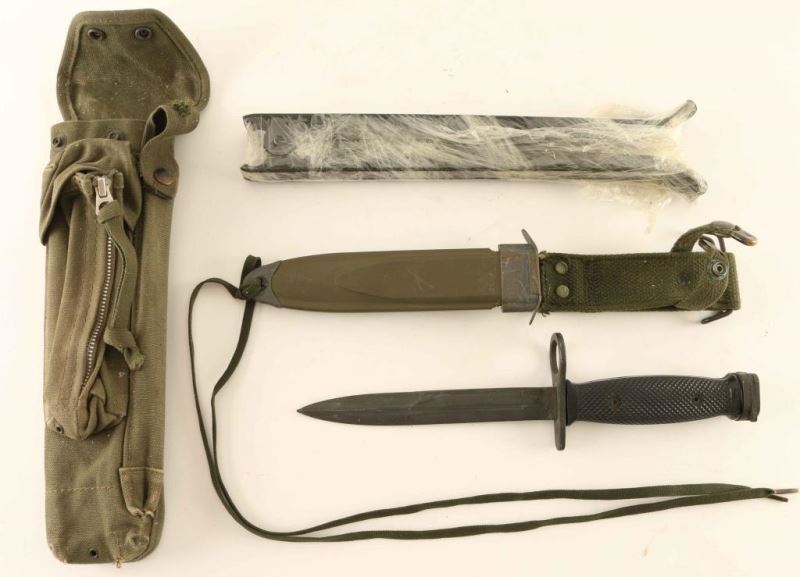 Bayonet is 11 5/8" overall with a 6" blade that shows use. Black composite handle. Comes in a green plastic and webbing sheath. Also included is a tripod in a green canvas bag.