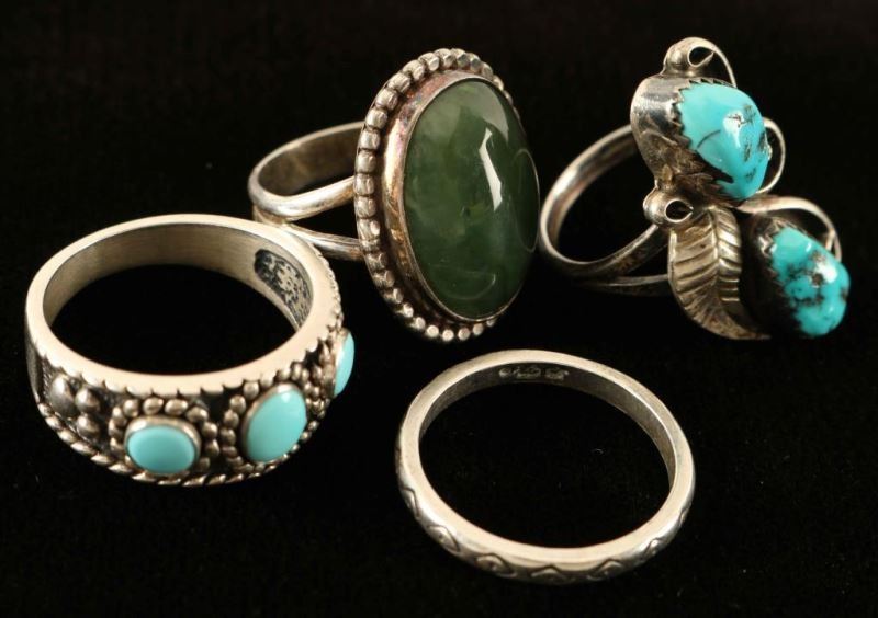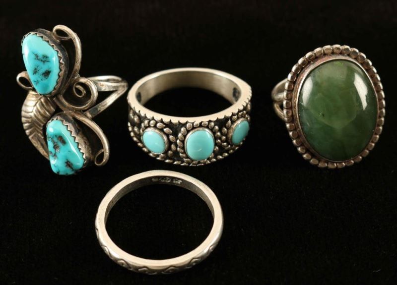 Including; ring with two natural turquoise stones with swirl and feather motif size 6 3/4, band with three turquoise stones and a bead design marked 'QT' and '925' size 10, large oval of green jade with rope design signed 'T Gimenez' and 'Sterling' size 7, and a sterling silver band with diamond design-artist signed and marked '925' size 9.