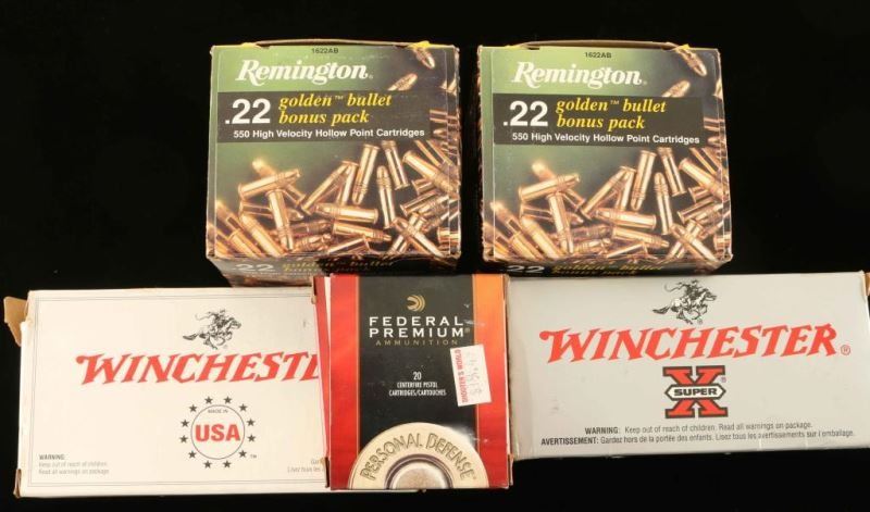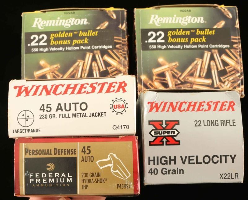 Consists of approximately 1,300 rounds of .22 Long Rifle ammo by Remington & Winchester, 20 rounds of Federal Personal Defense 230 grain Hydra-Shok JHP .45 Auto and 26 rounds of Winchester whit box 230 grain FMJ .45 Auto.