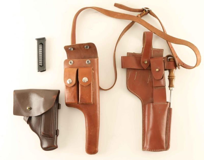 Including; Mauser 1896 Broomhandle holster-Chinese with strap, Mauser 1896 Broomhande holster-Chinese with cleaning rod and strap, and a Makarov holster with magazine.