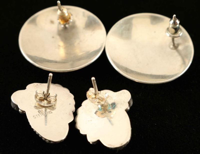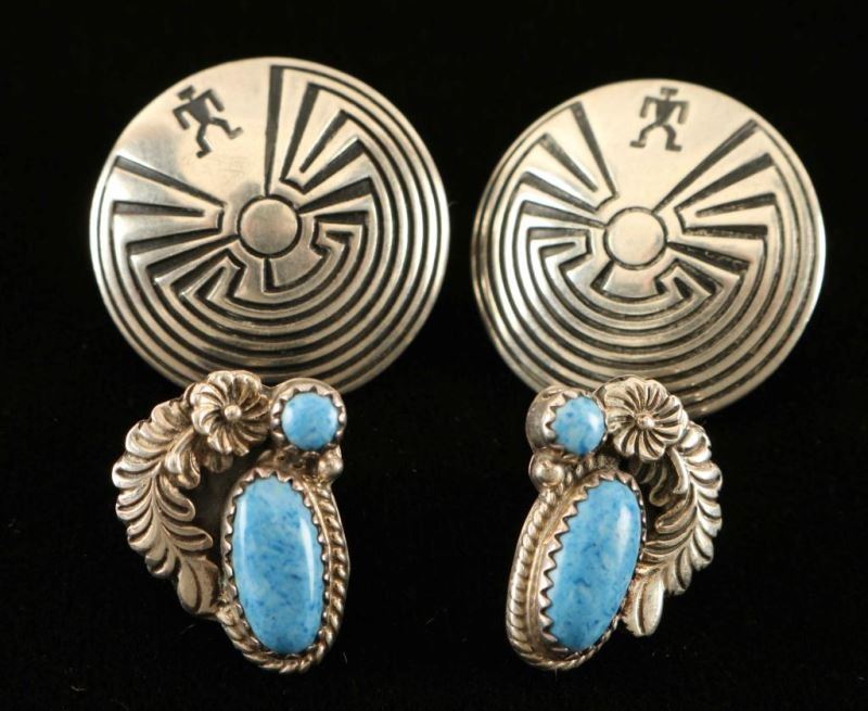 One pair of round post earrings with 'Man in the Maze' design marked 'Sterling' and a pair of turquoise stone earrings with floral and feather motif marked 'RS' and 'Sterling'.
