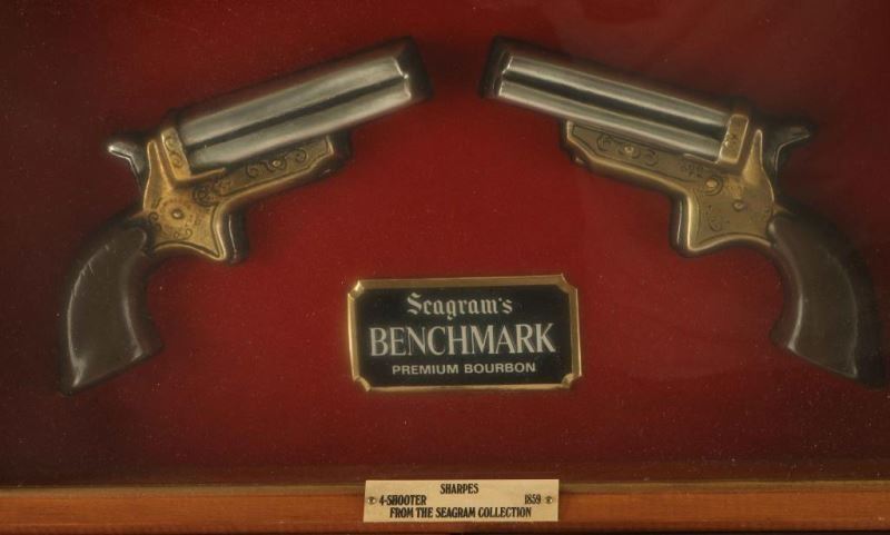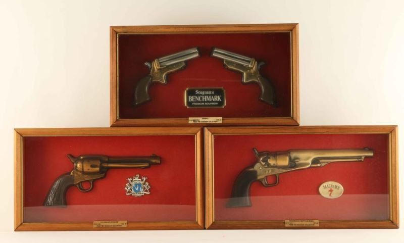 All three are from the Seagram's Collection in wooden shadowboxes with red fabric background, Seagram's advertiser and brass title plate. Including; U.S. Cavalry Revolver, Peacemaker Frontier, a pair of 1859 Sharpes 4-Shooters. All boxes measure 17"w x 9"h.