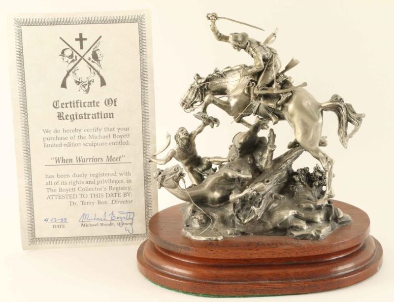#73 of 1500, by Michael Boyett, entitled "When Warriors Meet", hand signed in marker on wood base, measures 6 1/2"X6"x4", includes certificate of registration