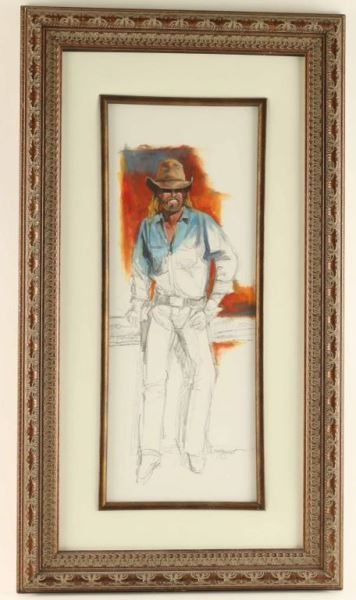 "Canyon Creek Ranch Hand" signed lower right. Image measures 19"x7" with white mat and gold fillet in ornate gold wood frame. Gary Bennett is a well known Arizona artist for his depiction of wildlife and Native people.