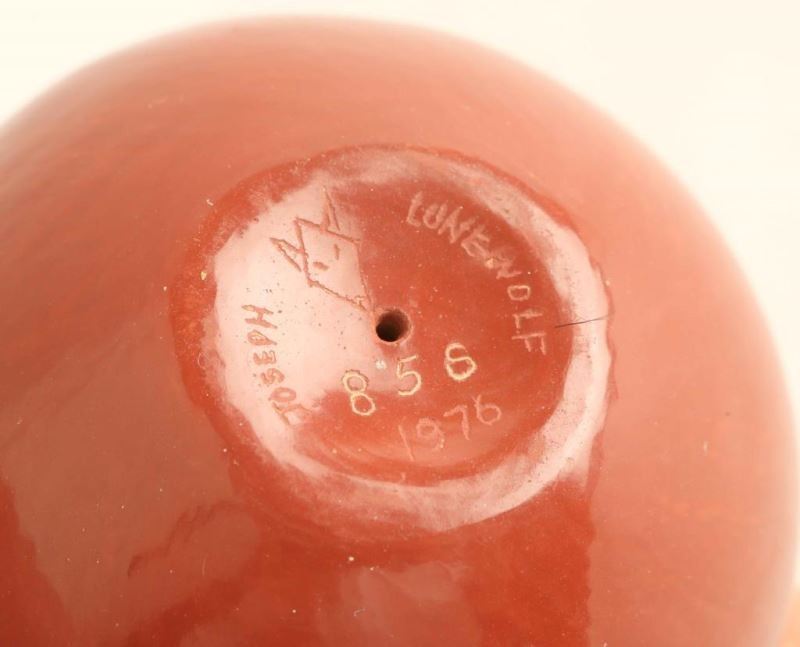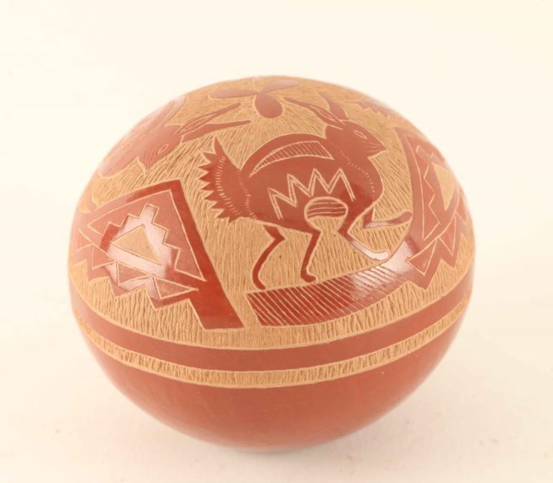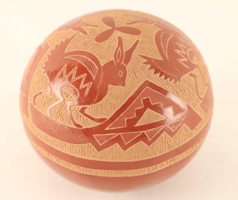 Red clay incised carved ball with jack rabbits and geometric designs. Signed 'Joseph Lone Wolf 856, 1976' Measures 2 1/4"x2 1/2".