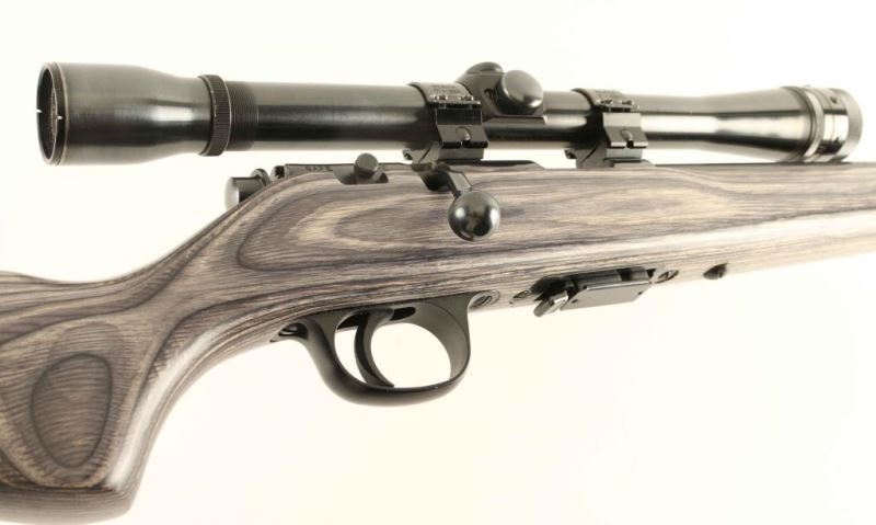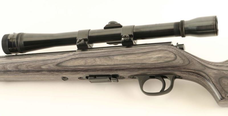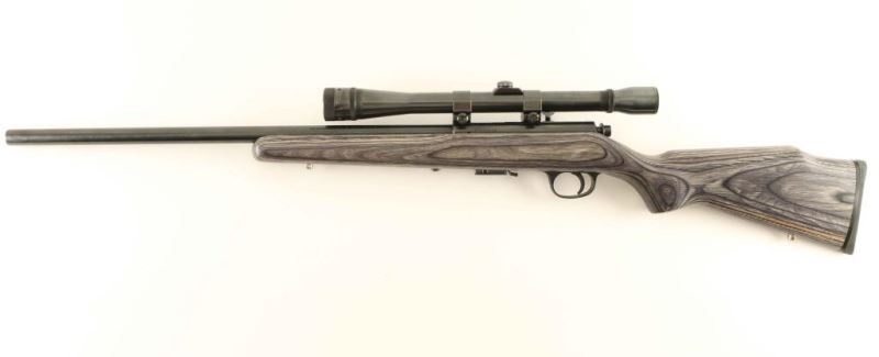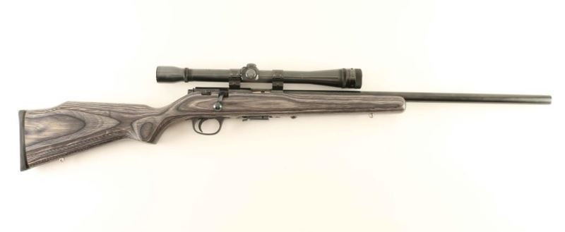 American made bolt action sporting rifle chambered in .17 Hornady Magnum Rimfire, manufactured circa 2007. Features a blued finish, heavy 22" barrel without provisions for sights, Weaver K10 10x scope, partially serrated trigger, manual safety on the right side of the receiver, detachable 7 round magazine, and grey laminated wood pistol grip shoulder stock with swivel studs & factory recoil pad. Rifle exhibits approximately 95% of it's original finish showing scattered scratches and a few specks of light surface rust on the barrel. Action is smooth, bore is excellent, optics are clear and the wood stock is fine. Condition is NRA Very Good++. ***Modern Firearm***