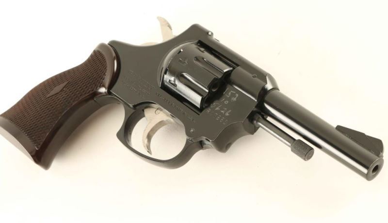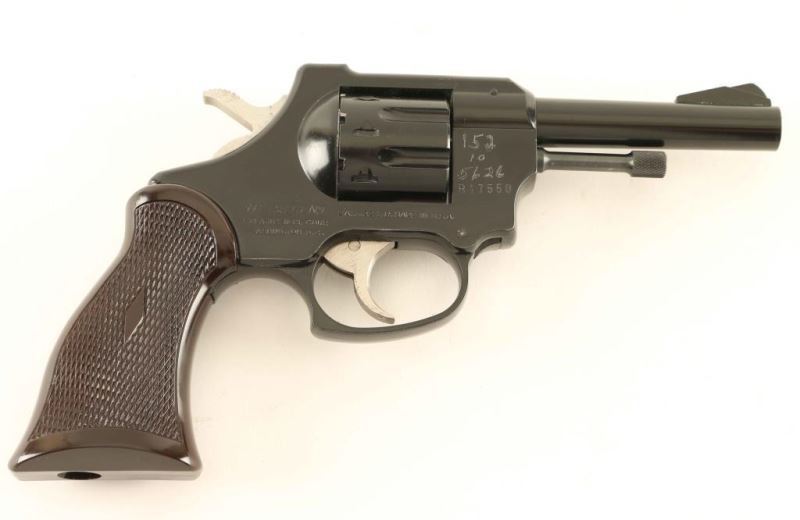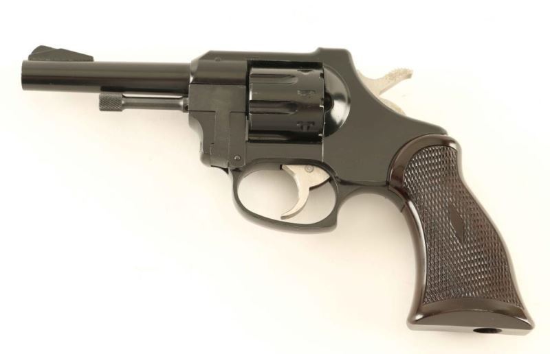 SN: R17550 American made double action rimfire revolver chambered in .22 Long Rifle. Features a black finish, 4" barrel, ramp front sight, square notched rear sight, fluted 8 shot cylinder, alloy frame, smooth trigger, serrated hammer spur, and one-piece diamond checkered brown plastic grips. Revolver retains most of it's original finish showing little wear and "152/10/5626" scratched into the to right side of the frame above the serial number. Action is sound with some play in the lock-up, bore is very good and the plastic grip is fine. Condition is NRA Very Good. ***Modern Firearm***