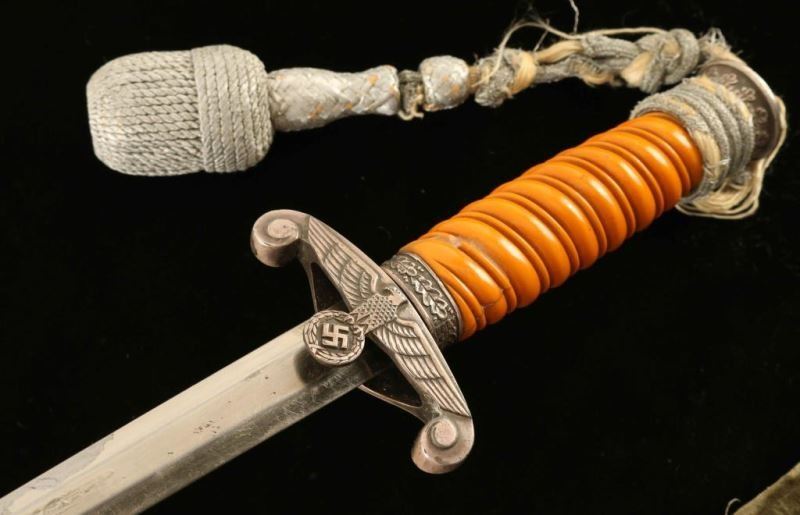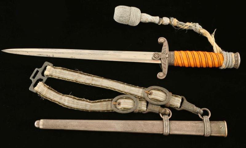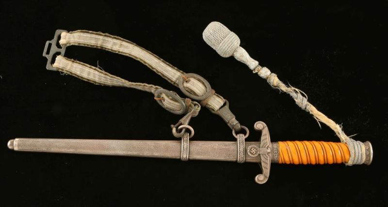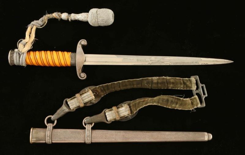 Unmarked with correct hangers and portapee but frayed and in poor condition. Some flaking to the blade, missing leather washer.