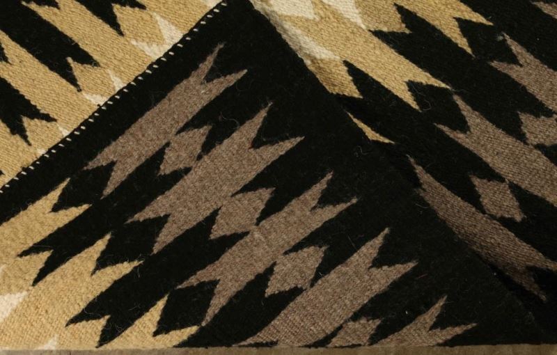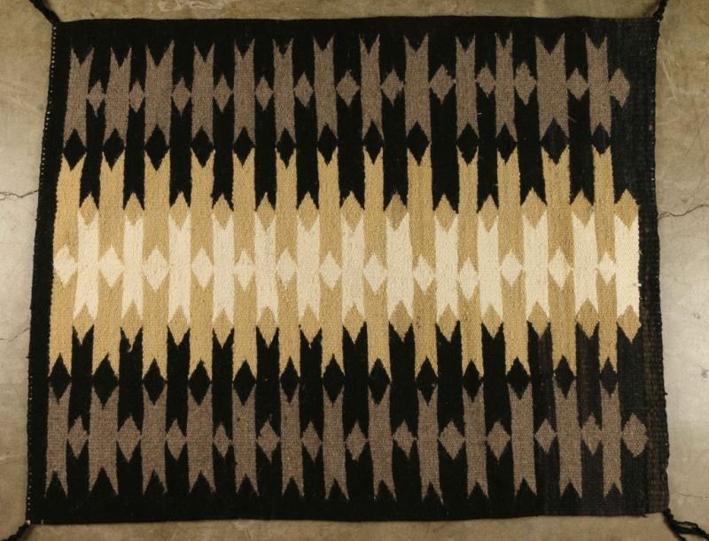 Woven rug with geometric design in black, gray, tan and white. Measures 29"x36" Good condition, shows some wear.