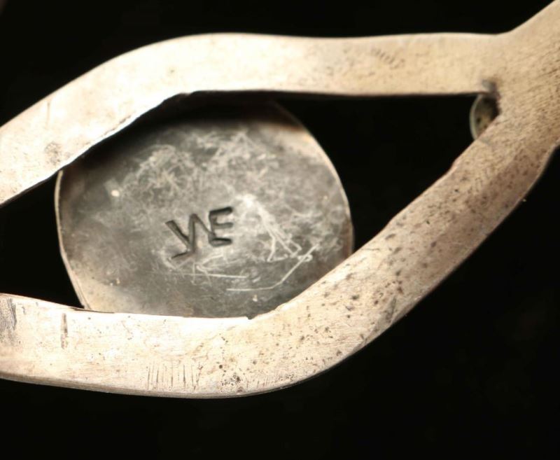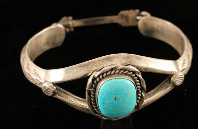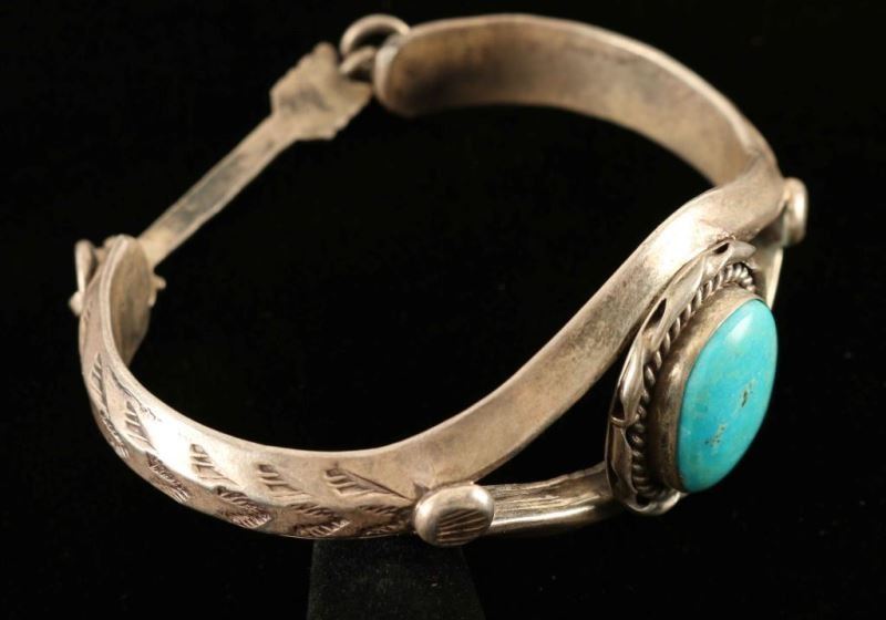 Bracelet with herringbone pattern etched on sides holds a large 3/4" cab of turquoise with rope design in the center. Back has a unique arrow clasp. Small chip on edge of stone. Signed by artist.