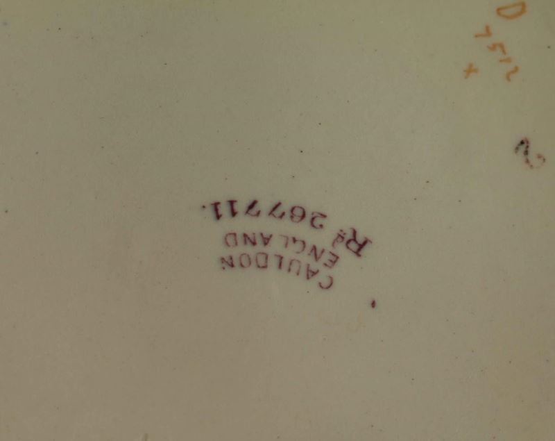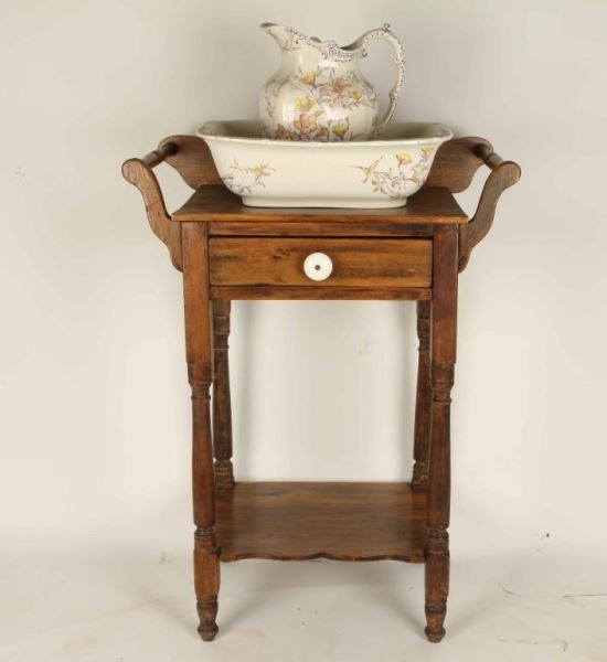 Maple wood with a single drawer with white porcelain handle and lower gallery shelf. Includes a pitcher and slop jar by Cauldon England with a floral motif al matching stand measures 35"T by 24" W. In fair original condition.