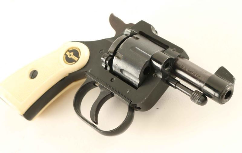 German made small frame double action revolver chambered in .22 short, circa 1963. Features a black finish, 1.8" barrel, blade front sight, square notched rear sight, smooth trigger, serrated hammer spur, fluted six shot cylinder, manual ejector rod, alloy frame and two-piece checkered faux ivory grips. Revolver exhibits approximately 85% of it's original finish showing moderate handling wear and some light oxidation on the cylinder. Action is sound with solid lock-up, bore is pristine and plastic grips are good with a small crack on the top of the right panel. Condition is NRA Good. ***C&R Firearm***