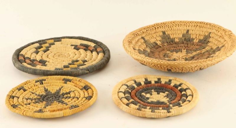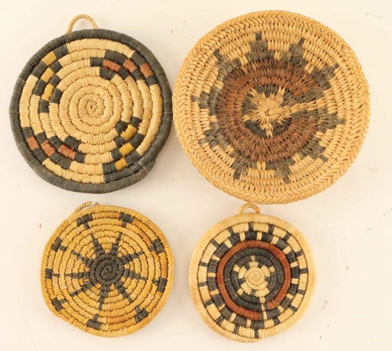 Including (2) wedding basket designs, (1) sun design and (1) stair step design. Measure from 3 1/2" in dia. to 5 5/8". All in good condition.