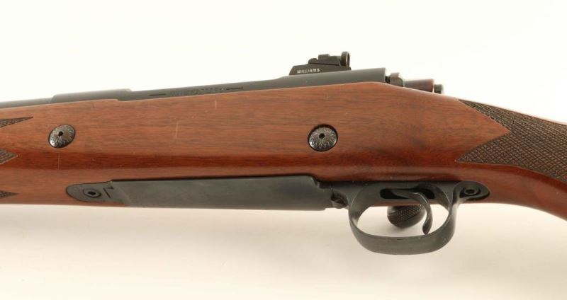 'Safari Express' American made bolt action sporting rifle chambered in .375 Holland & Holland Magnum, manufactured circa 2004. Features a matte blued finish, 24" barrel, ramped blade front sight with bead top, Williams sliding aperture receiver sight, serrated trigger, jeweled bolt, manual three-position safety, internal box magazine with hinged floor plate, drilled & tapped receiver, swivel studs, and checkered Monte Carlo style walnut stock with satin finish & Decelerator recoil pad. Rifle exhibits approximately 75% of it's original finish showing scattered wear & rust. Action is smooth, bore is pristine and the wood stock is fine with few minor blemishes. Condition is NRA Good. ***Modern Firearm***