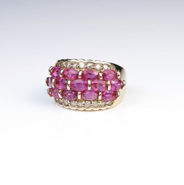 featuring 13 fine vivid pink tourmalines weighing approx 5.00 carats accented with 18 side diamonds weighing approx. 0.40 carats of H-I colors and SI clarity set in a 14K yellow gold custom made setting.
