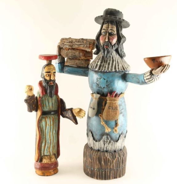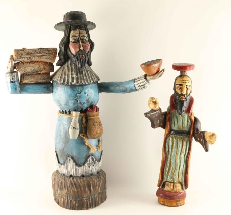 (1) Carved and painted Spanish settler holding logs on one arm and a bowl of beans in the other with a bottle of wine and bag of chilies on his belt. Small chip off top of hat measures 28 3/4" x 22 1/2" x 8". (1) Hand painted, bearded man in robes with candle holder on his head. Measures 21"x 10 1/2".
