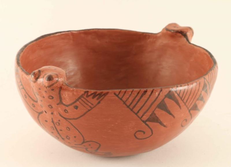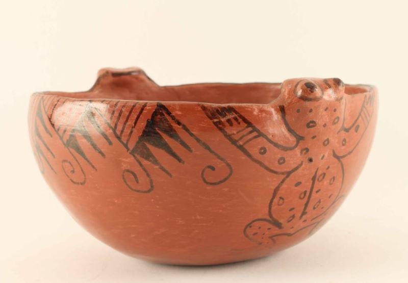 Circa 1920s with two modeled frog heads on rim with black geometric designs on red clay. Good condition. Measures 8"x3 1/4".