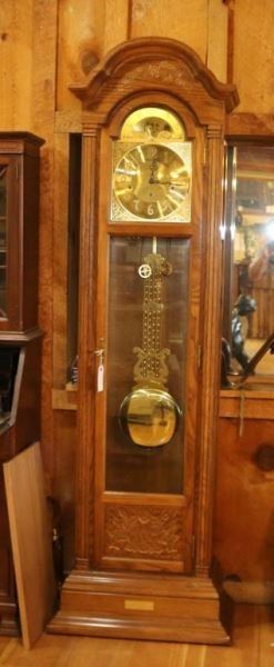 Oak cabinet with arched top and carved floral accents. Glass front door displays the gold face with rotating lunar cycle and a large brass pendulum with three hanging chimes. Measures 25"l x 79"h x 14"w.