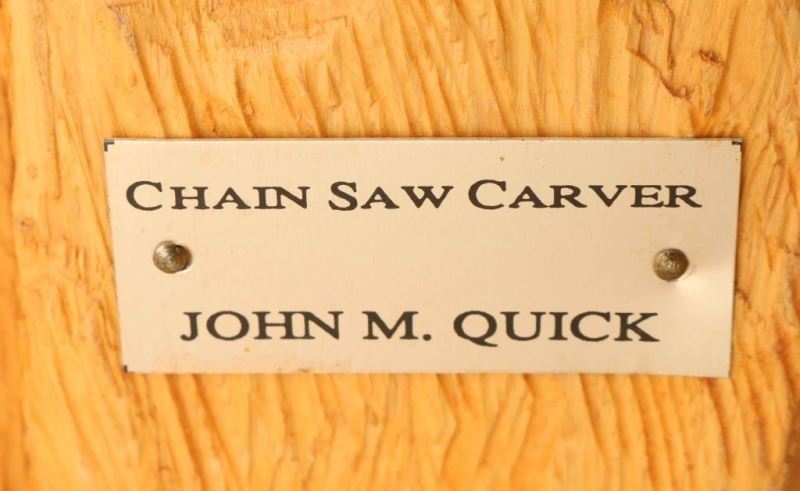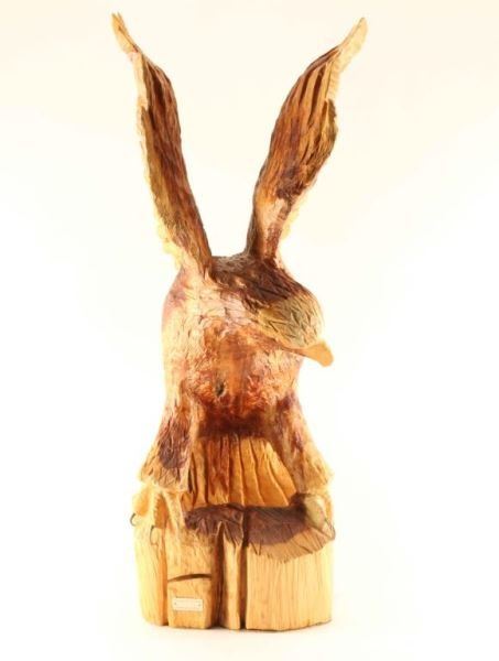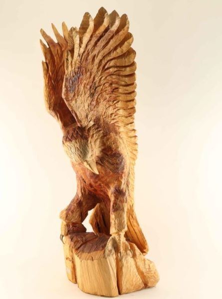 Wooden eagle carved with outstretched wings. Measures 40"h x 14 1/2"w x 11"d approx.
