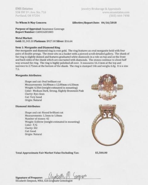 featuring a 6.50 carat peach colored morganite accented with 42 round fine set diamonds weighing approx. 0.60 carats with F-G colors and SI clarity in a 14K rose gold setting. Fully appraised value $5.500.00.