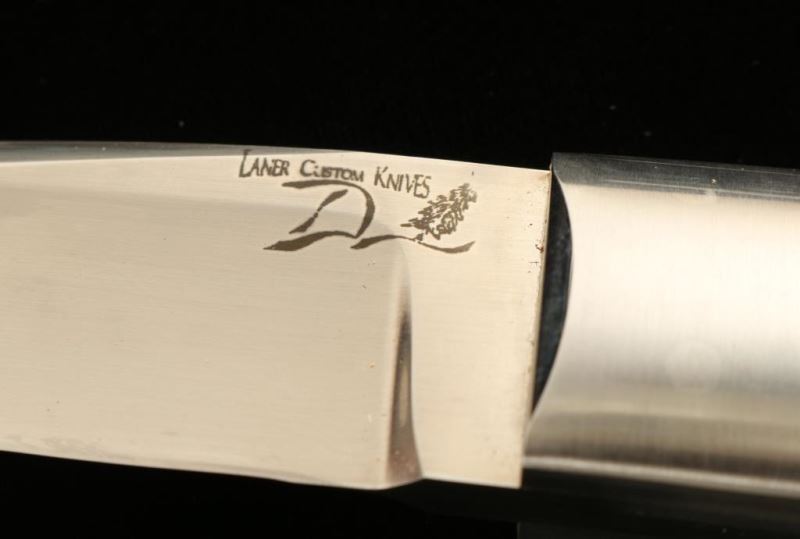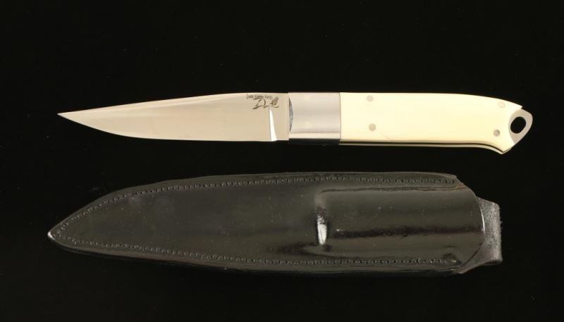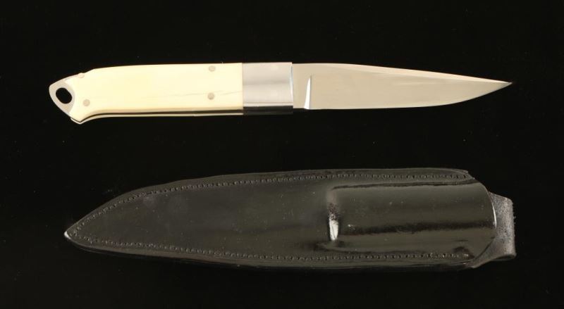 Stainless Steel Blade 9 1/2 overall 4" Blade. Bone handled with leather sheath. Handle has Chip