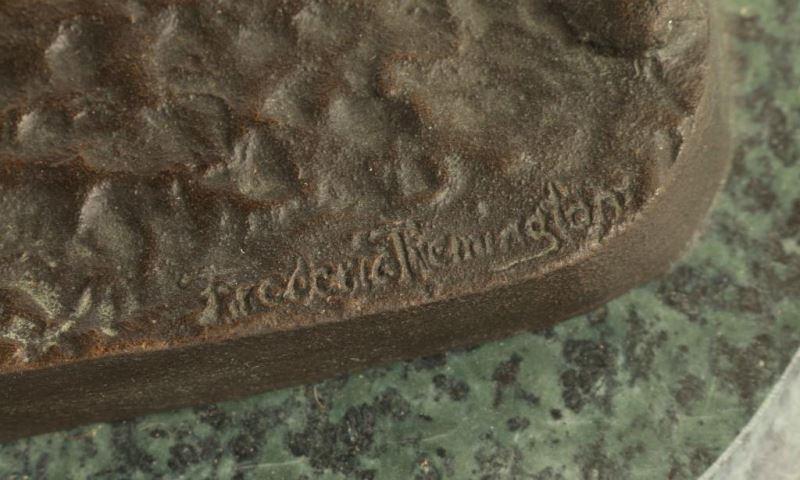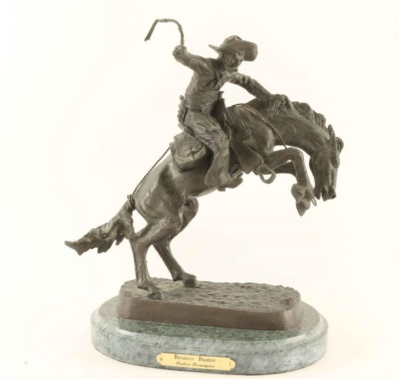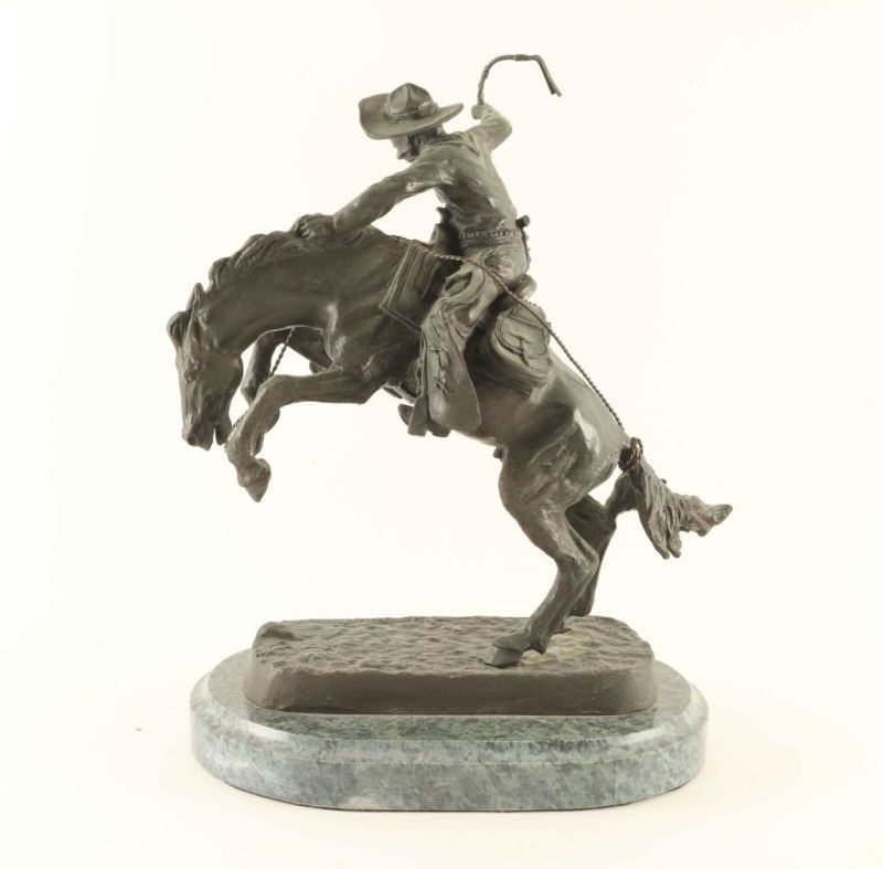 by Frederic Remington entitled "Bronco Buster" measures 13"x10" on marble base. Quality restrike.