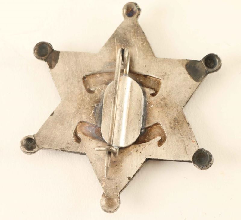 Silver metal badge in six point star shape with thin vertical pin back. Measures 2"x2 1/4". In small 4 1/2"x5 1/2" Riker mount.