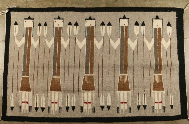 Black border with gray background and five yei figures holding feathered spears in black, gray, brown, red, blue and white. Measures 47"x30". Good condition.