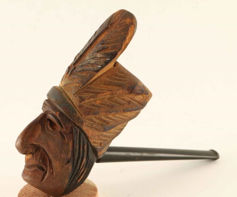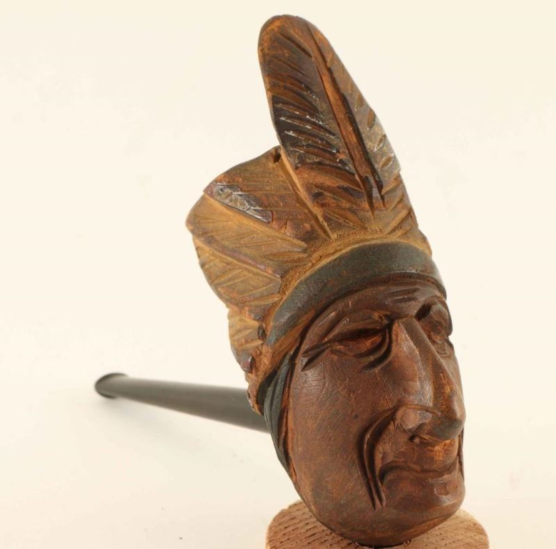 Head of a smiling Chief with headdress carved out of wood on a plastic stem. Measures 4 1/2"x5". 20th century.