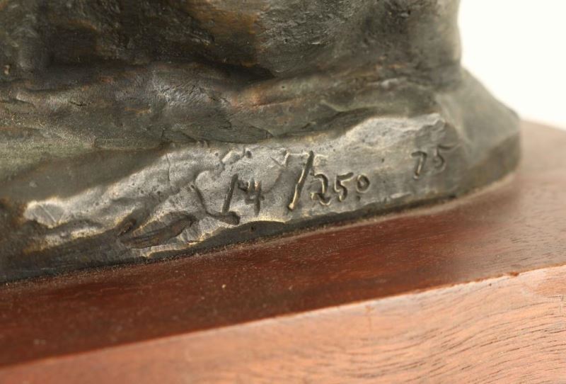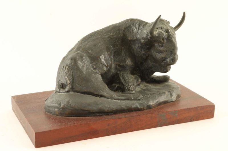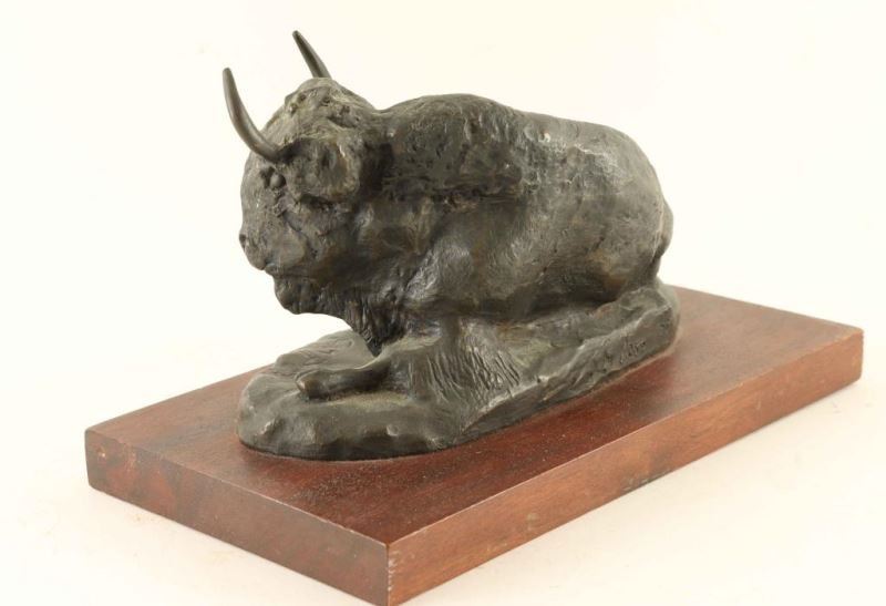 depicting a buffalo laying down, restrike, signed on base. Measures 9 1/2"x5".