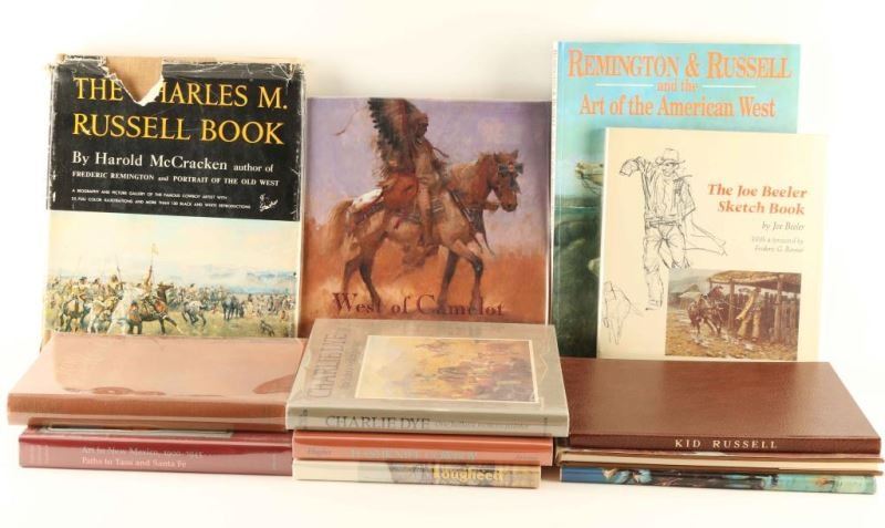 Including' Charlie Dye One helluva western painter, Co Bar, Bill Owen Depicts the Historic Babbit Ranch, Kid Russell, A Rare Collection of Early Cowboy Art-number 6/22 and is signed by Walt Wiggins, Creating Illusions-signed by Harold L Lyon, Remington & Russell and the Art of the American West, Hashknife Cowboy, Art in New Mexico 1900-1945 Paths to Taos and Santa Fe, Lougheed, Trails Plowed Under, The Joe Beeler Sketch Book, West of Camelot, and The Charles M. Russell Book.