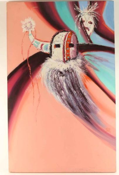 "Large Kachinas" by John Jones in vivid colors of blue, aqua, orange, and purple with white impasto for dimensional effect. Signed lower right. Measures 48"hx30"w. Some marks on bottom and top left corner of canvas.