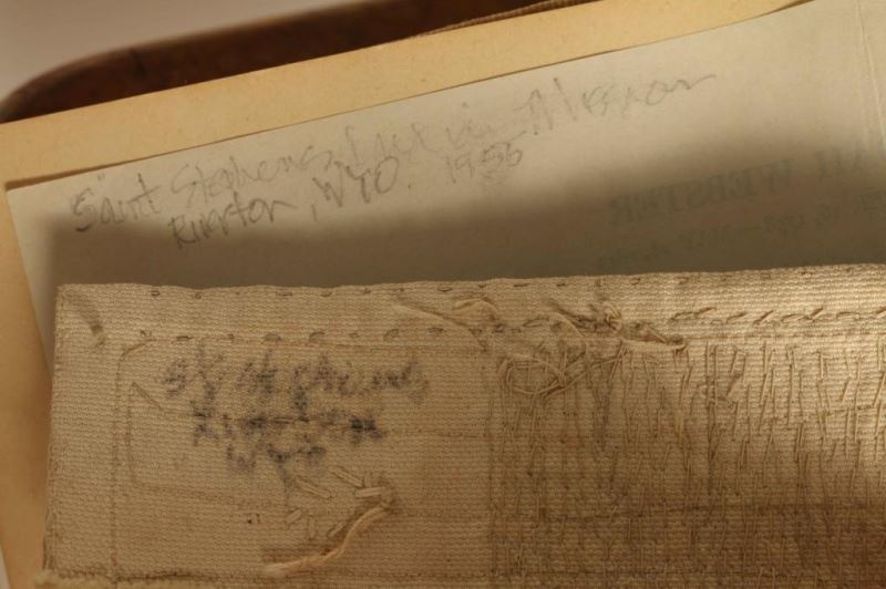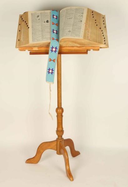 All wood bookstand with three legs and tilted platform for display. Includes a Webster's Dictionary copyright 1934 from the St Stephens Mission Riverton, WY. Includes a beaded bookmark/belt with geometric designs and muslin backing.