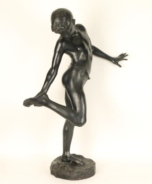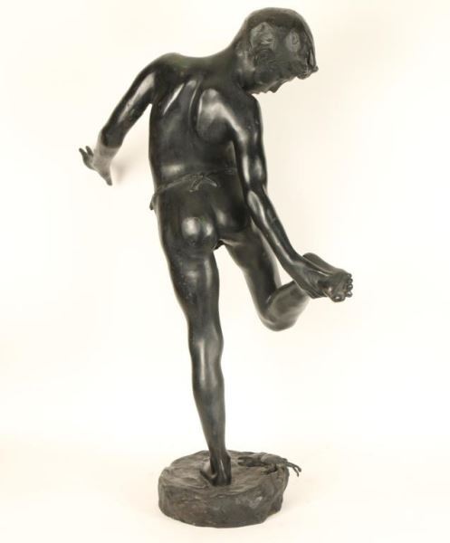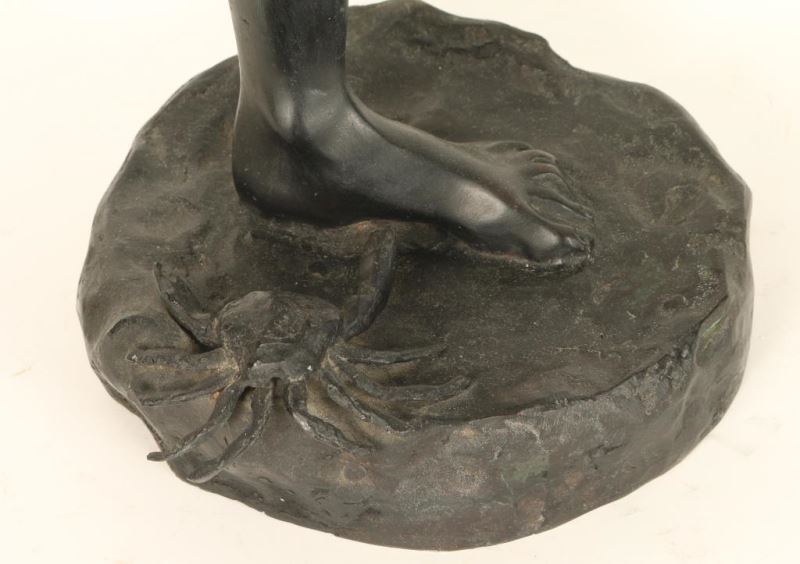 Depicting a boy stepping on a crab. Signed 'Delotta' on base. Has a round loss to leg and a 2" crack on right buttock. Finish has been altered in scattered areas. Measures 38"h x 12"w at base.