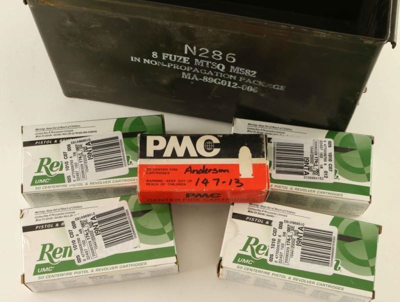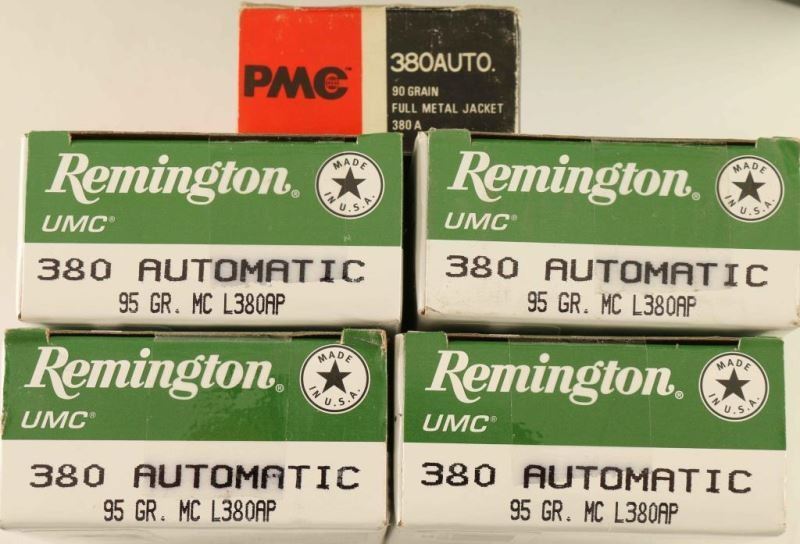 Remington UMC 95Gr MC L380AP, 200 Rds and a box of PMC 90Gr FMJ 380A, 50 Rds. All in a green metal ammo can.