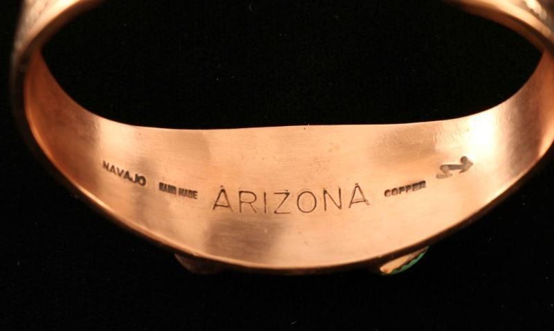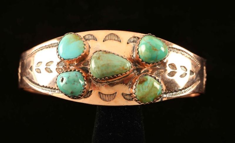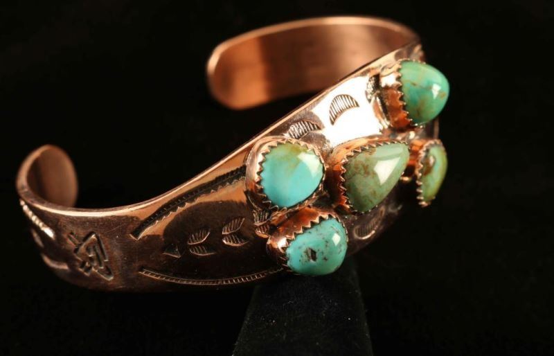 Rich warm glow of copper showcasing five genuine, free form, hand cut and polished turquoise stones. They are bezel set and accented with traditional patterns. At the center it's 7/8" wide and gradually tapers to the back. Stamped 'Navajo Hand Made Arizona Copper'