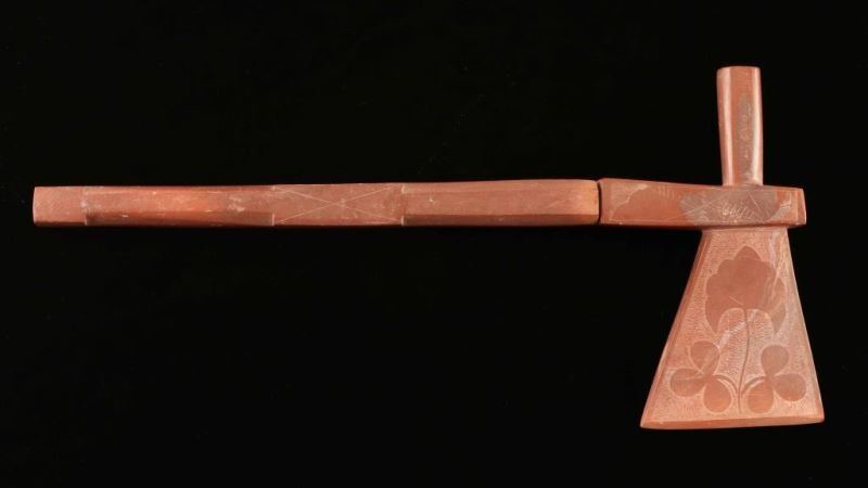 20th Century Tomahawk end with a shaped Catlanite bowl and a carved cherry and floral design. Measures 7"x4 1/2" with a Catlanite stem measuring 10 1/2"