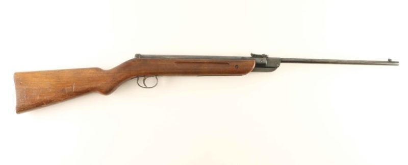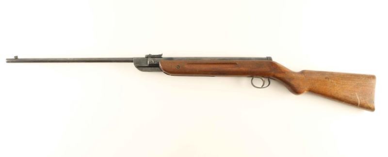 German made break barrel action pneumatic pellet rifle with .177 caliber bore. Features a blued finish, 17.25" barrel, dovetailed inverted 'v' front sight, tangent rear sight, smooth trigger metal trigger guard and smooth walnut pistol grip shoulder stock with grooved forend & serrated bare butt. Rifle exhibits approximately 60% of it's original finish showing heavy wear and some light scattered surface rust. Action performs well, bore appears excellent and the wood stock is fair with heavy wear & a small crack extending from the rear of the receiver on the right side. Condition is fair.